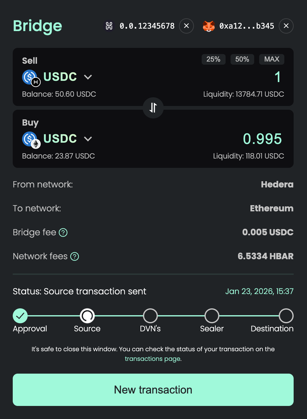 - Once the transaction is validated by the DVNs (Decentralized Verifier Networks), your tokens will be delivered to your wallet on the destination chain. This typically takes a few minutes.